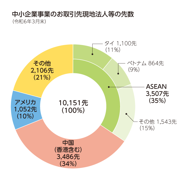 中小企業事業のお取引先現地法人などは、約1万社に達しています。SBLCは、平成24年度の制度開始以来、累計で960社(令和6年3月末時点)が利用しています。クロスボーダーローンは、令和3年1月の開始から累計298社(令和6年3月末時点)の利用実績があります。